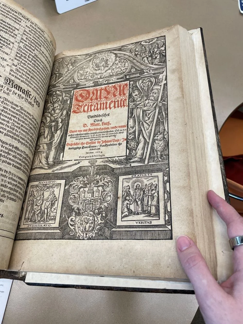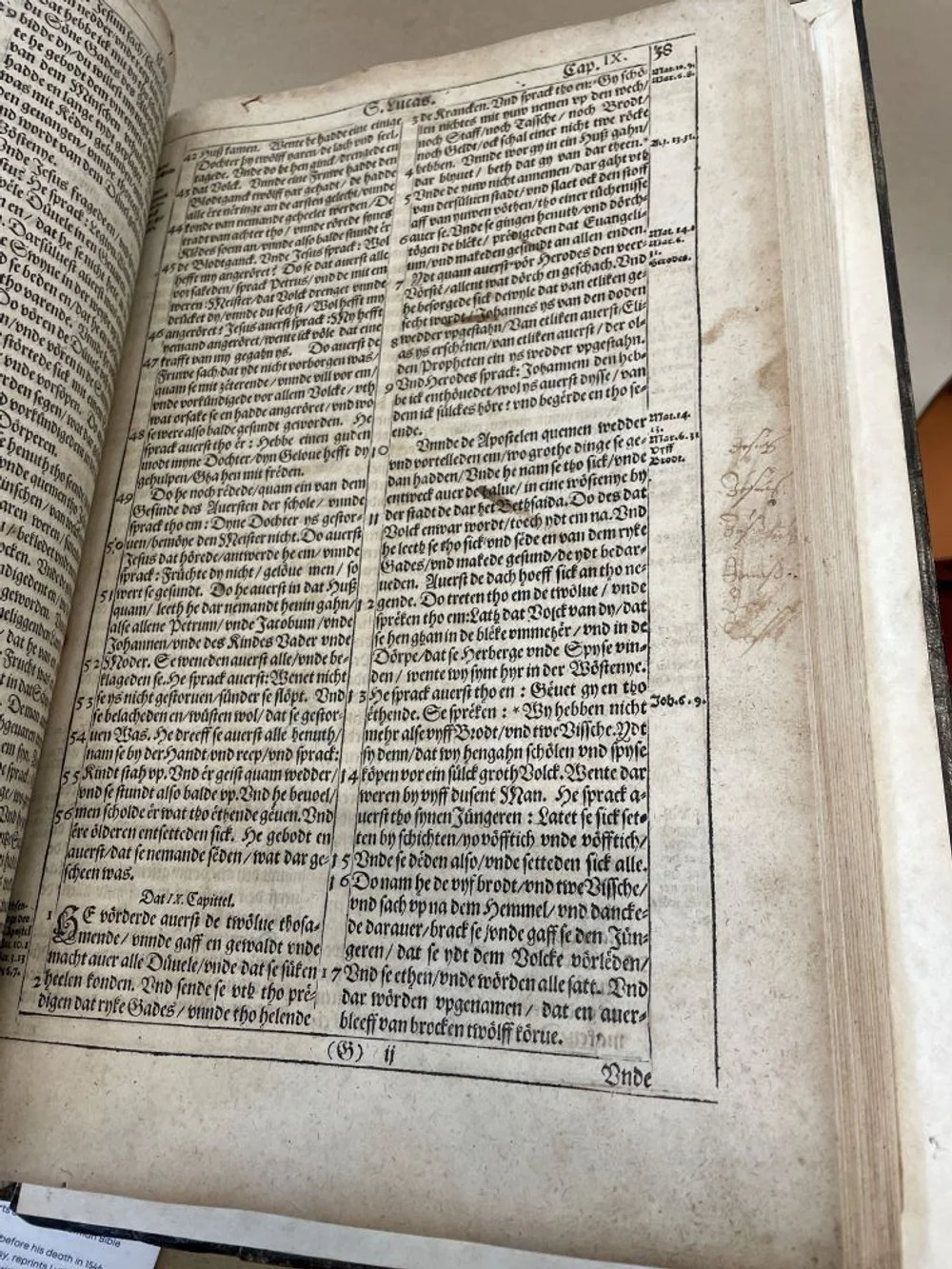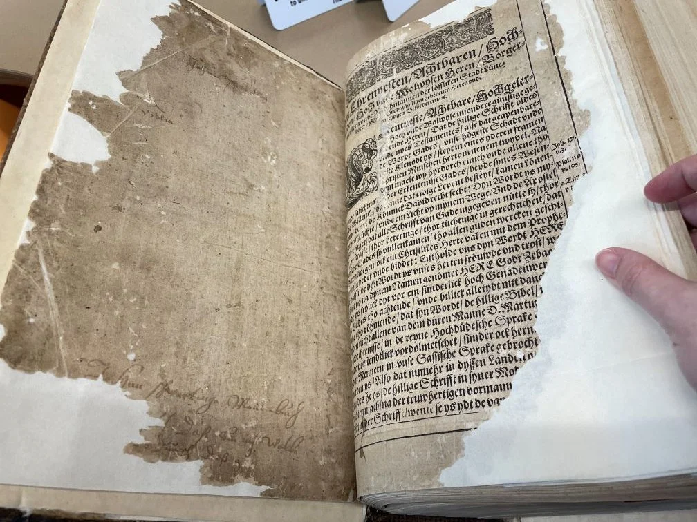 A few days after that, something else happened that changed my mind about it. I went to see the Low German Bible from 1614 and noticed that it was marked in some spots. The most notable is the name of one of the owners, Johan Schwarting, written on the inside cover along with the inscription “my book” in German. He acquired this Bible when it was already over 200 years old. A few other pages inside the Bible have notes that someone scribbled in the margin. And at this point, centuries down the line, I think that those hand-written notes automatically make the book more interesting, because it’s like a time capsule that makes us think about people who lived so long before we did.